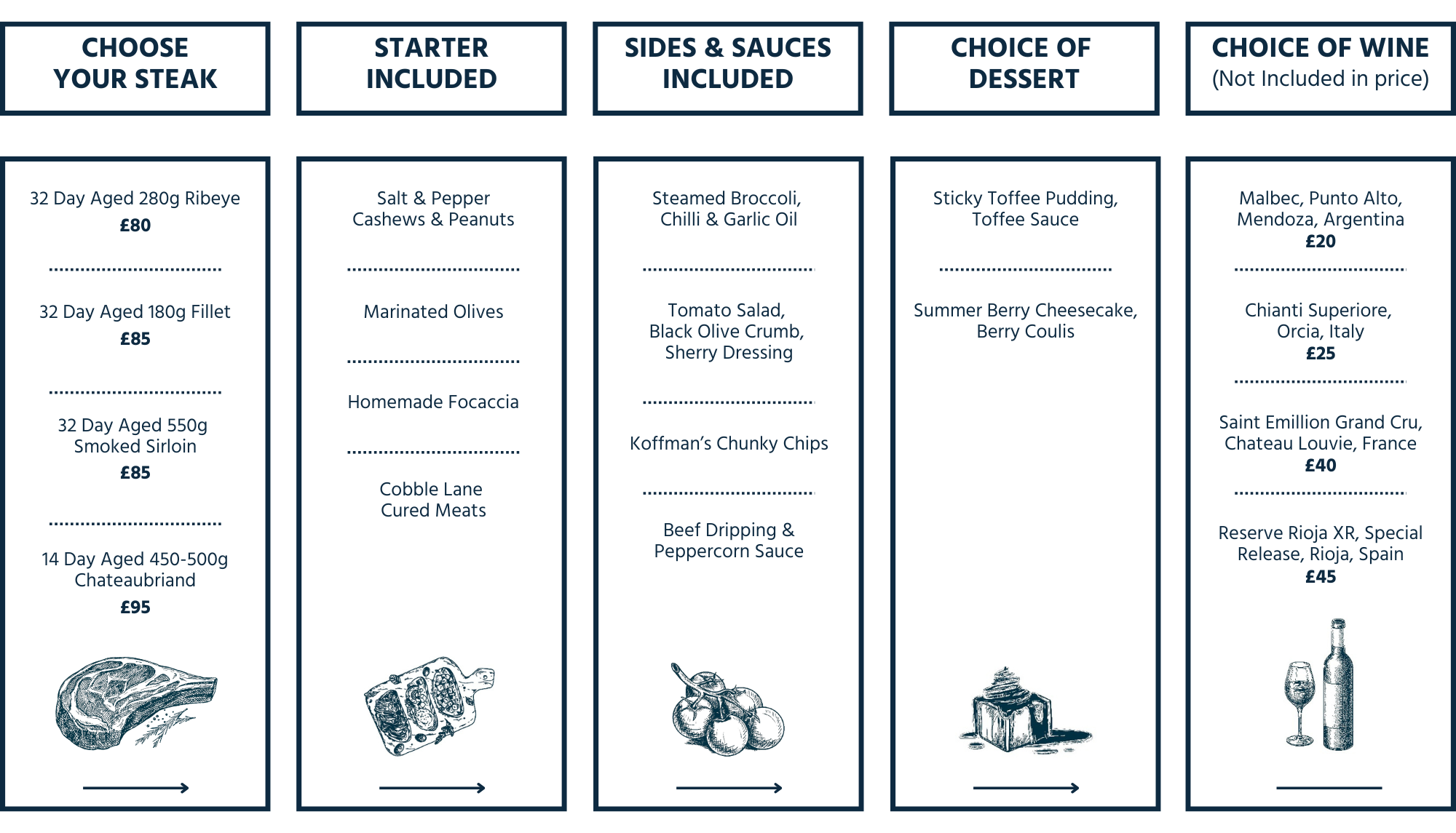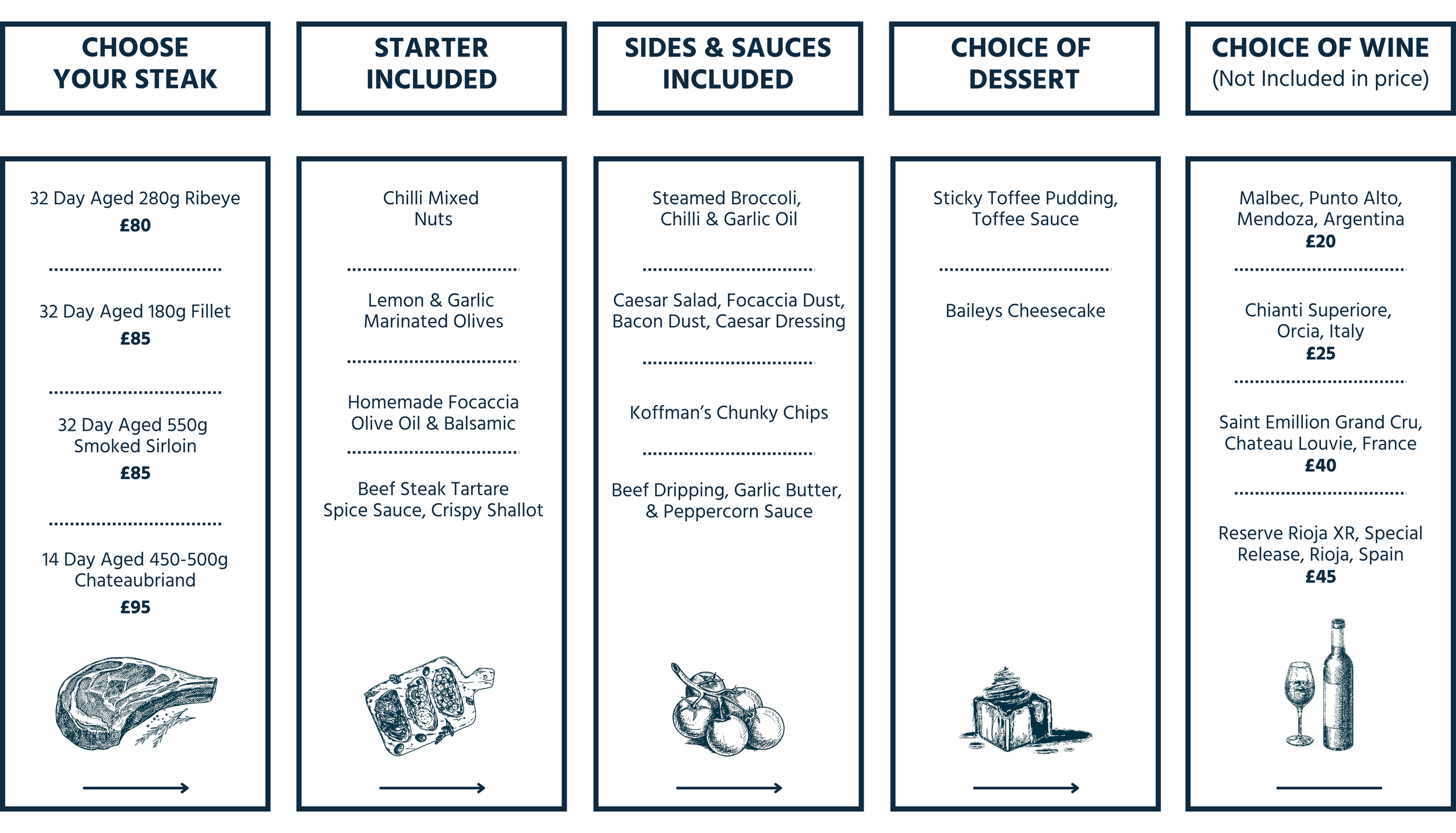 Treat yourself to an unforgettable meal in the comfort of your own home. Our Dine Inn boxes serve two hungry diners and include three homemade courses - featuring premium British steak, delicious sides, and our handcrafted sources.